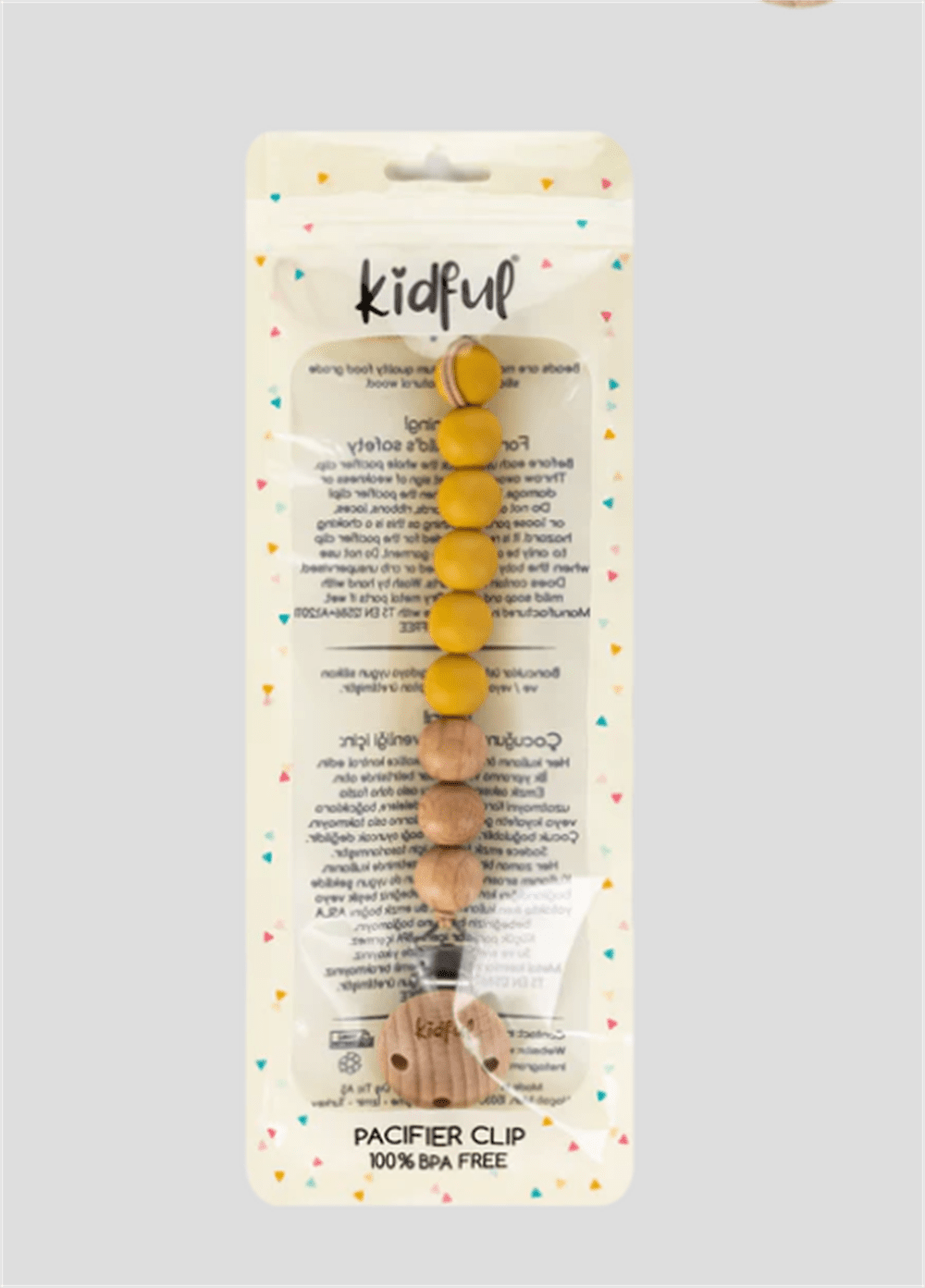 Kidful'un en ahşap emzik askısı serisinde, çocuk ürünlerinde kullanıma uygun olan %100 kayın ağacı ve birinci sınıf, gıda ile temasa uygun silikonlar kullanılıyor.