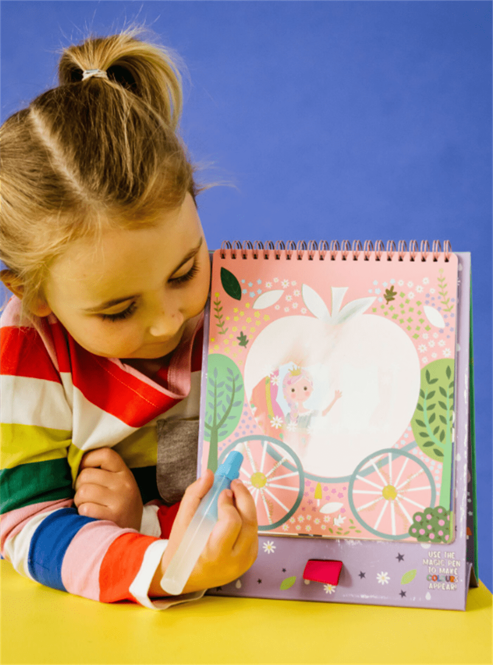 Birbirinden farklı 6 adet sayfa, bu eğlenceli sayfaları çevirmeye yarayan spiral aparat ve 1 adet suyla doldurulan kalemi mevcuttur. Su kalemi yardımıyla periler, kuşlar, atlar ve daha fazlasını renklendirebilirsiniz. Çocuklar boyadıkça renklenen bu masal dünyasına bayılacak!