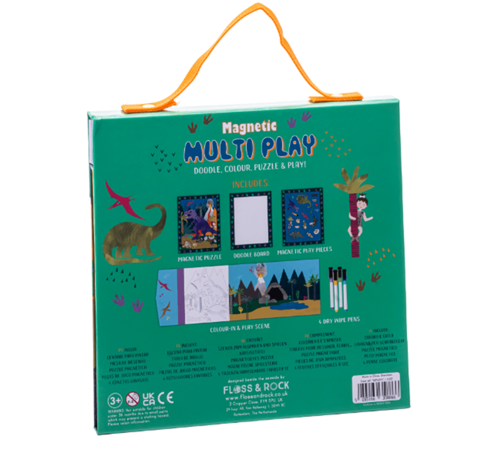 Karalama kartı, boyama, yapboz ve oyun! Floss & Rock Mıknatıslı Oyun Setimiz küçüklerimizi saatlerce eğlendirmek için 4 farklı aktivite içerir. Floss & Rock çoklu oyun setimiz; her biri 20 parçalı yapboz, 4 renkte silinebilir kalem ve silgisi, pop-out oyun parçaları, bir karalama ve bir boyama kartından oluşmaktadır. Ayrıca Floss & Rock çoklu oyun setinin tüm parçaları mıknatıslıdır, bu sayede istediğiniz yerde oyunları oynarken parçalarını kaybetmezsiniz. Oyunları oynarken açılarak düz formda kullanırken kutuyu katlayarak kapattığınızda her şeyin içine sığabildiği dekoratif bir kutu ortaya çıkmaktadır. Tekrar tekrar kullanabileceğiniz kutusunun taşıma kolonu sayesinde oyunu seyahatte, piknikte veya gezerken yanınıza alabilirsiniz.